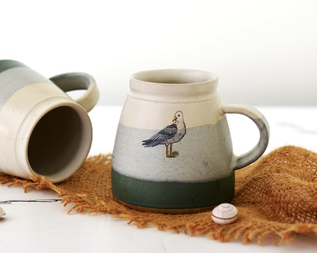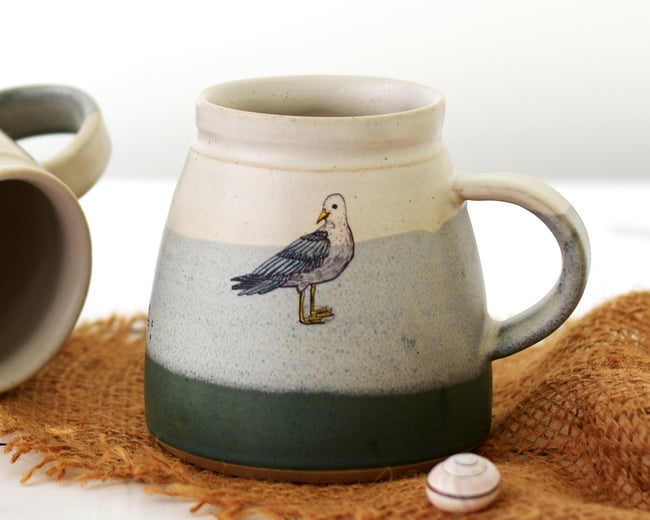 A cosy handmade ceramic mug with a hand-drawn seagull fused deep into our green and cream glazes.